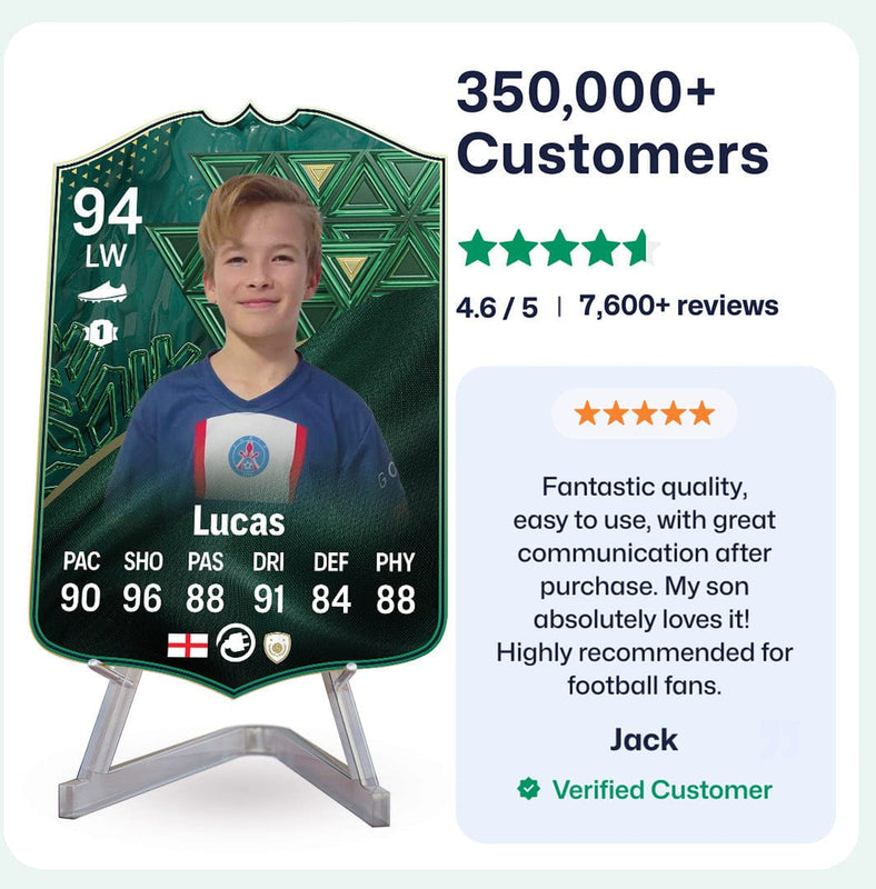 Yes! Our football card designers will remove the background from the photo you upload so it looks just like the football cards you might’ve seen games like EA FC 25, EA FC 24 or FIFA. We’ll also position the photo perfectly on the football card so it looks great. If there are any problems with the quality of your photo, we’ll reach out and let you know. Plus, our website's AI will remove the background on the image for visual purposes before purchase so you can see it without a background on the card.