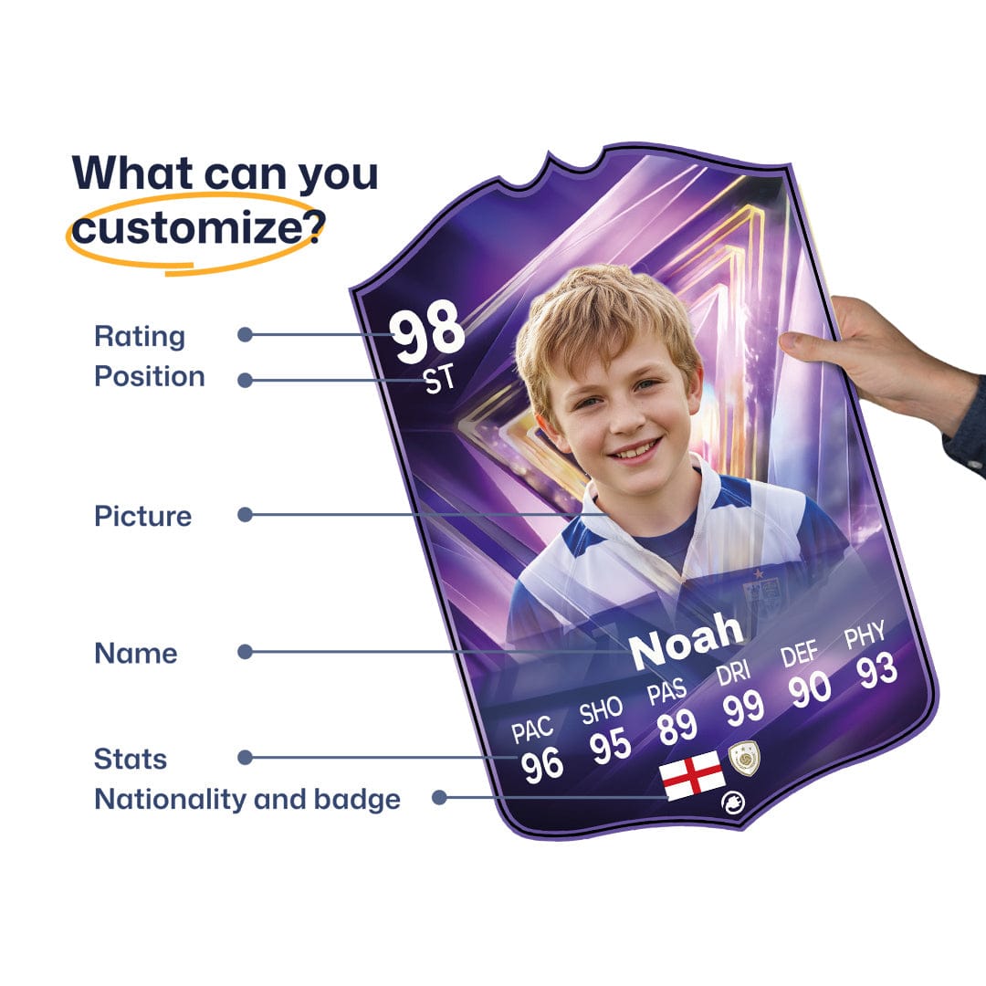 When it comes to personalising your card, the basic steps are to upload a photo and add a name to your card. Then you’ll add details like your player’s position and skill ratings out of 99 for each football skill shown on the card. Our online card builder makes this really easy. And if you aren’t a football card expert, don’t worry!