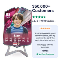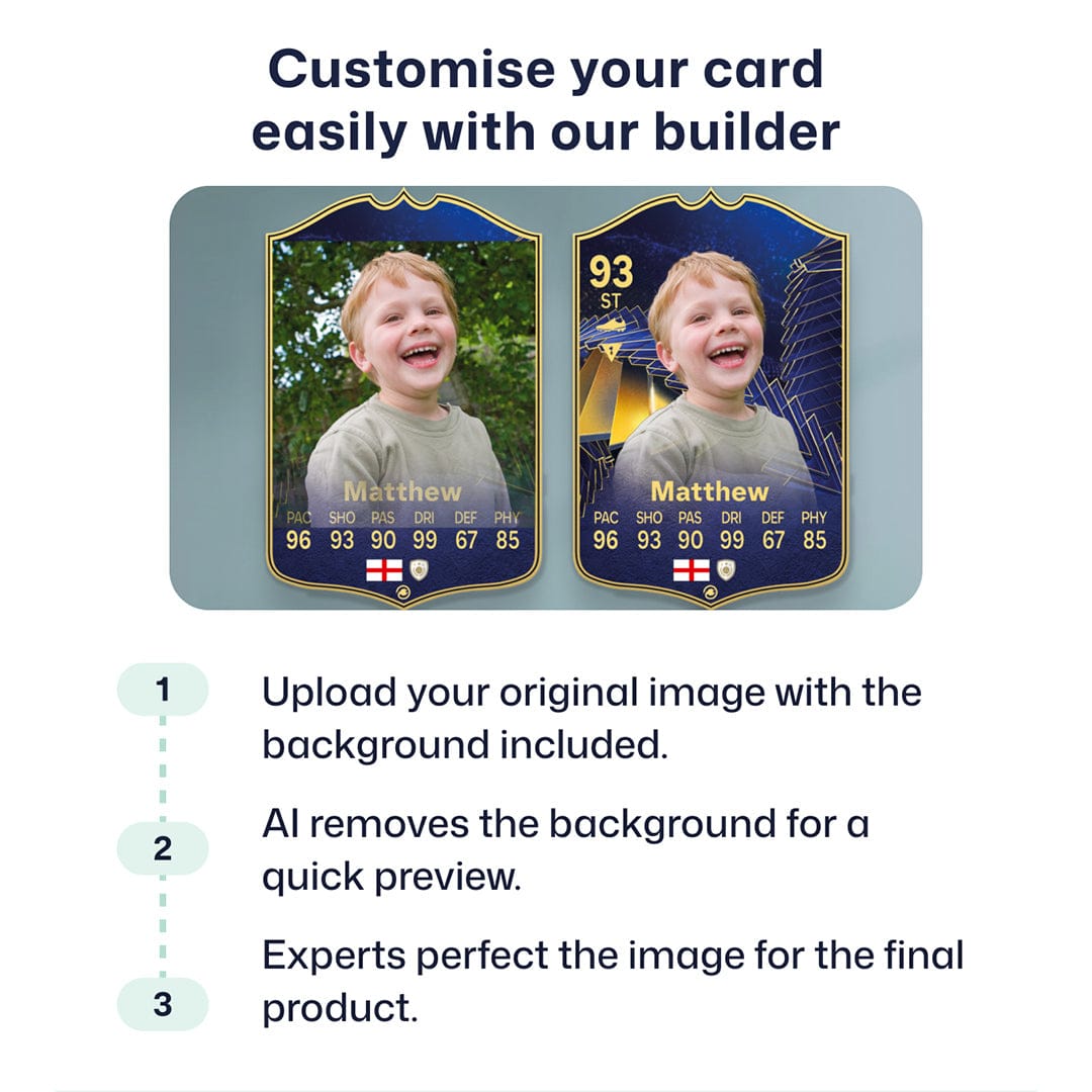 Yes! Our football card designers will remove the background from the photo you upload so it looks just like the football cards you might’ve seen games like EA FC 25, EA FC 24 or FIFA. We’ll also position the photo perfectly on the football card so it looks great. If there are any problems with the quality of your photo, we’ll reach out and let you know. Plus, our website's AI will remove the background on the image for visual purposes before purchase so you can see it without a background on the card.