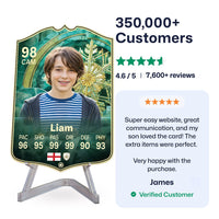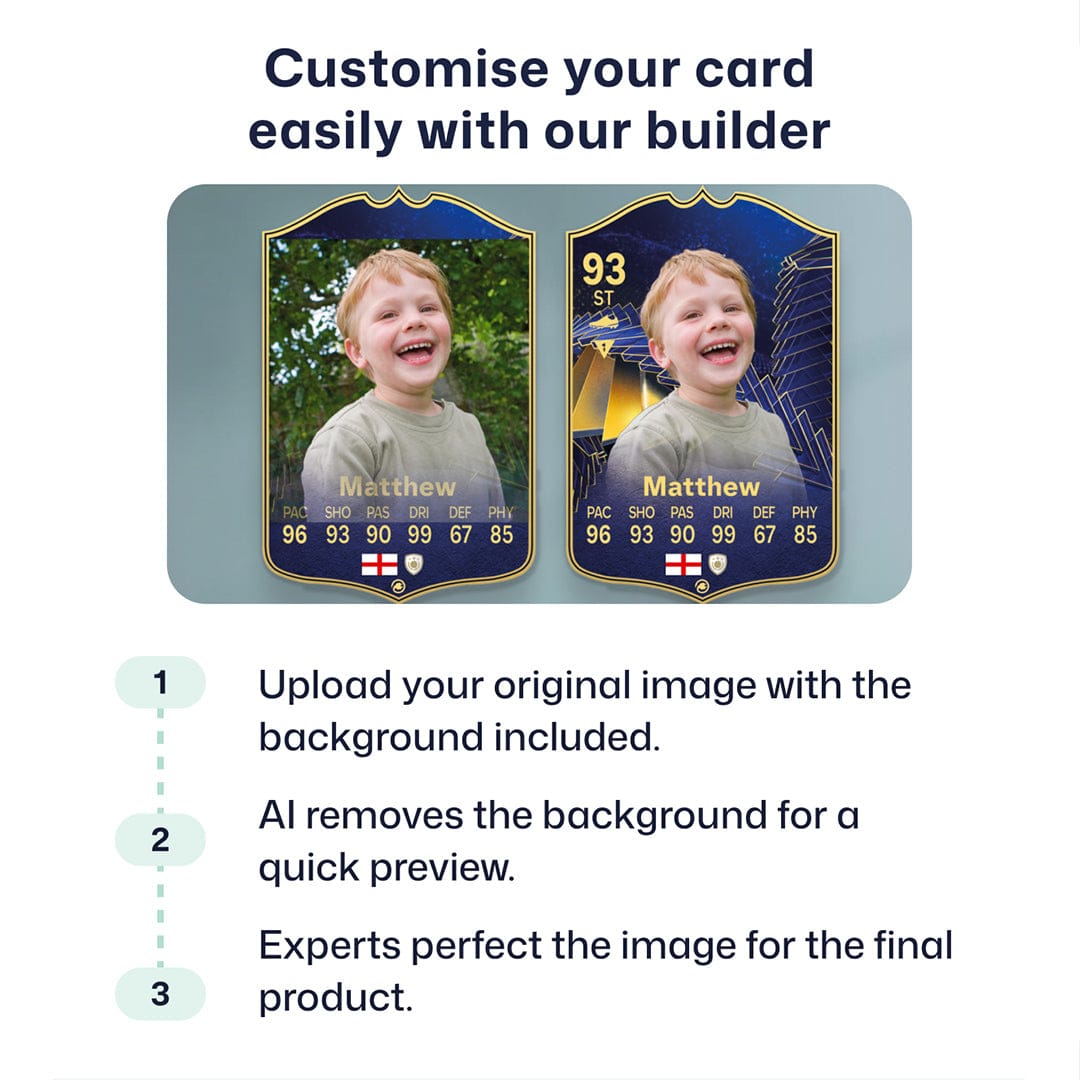Yes! Our football card designers will remove the background from the photo you upload so it looks just like the football cards you might’ve seen games like EA FC 25, EA FC 24 or FIFA. We’ll also position the photo perfectly on the football card so it looks great. If there are any problems with the quality of your photo, we’ll reach out and let you know. Plus, our website's AI will remove the background on the image for visual purposes before purchase so you can see it without a background on the card.