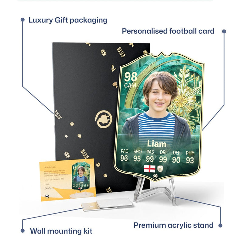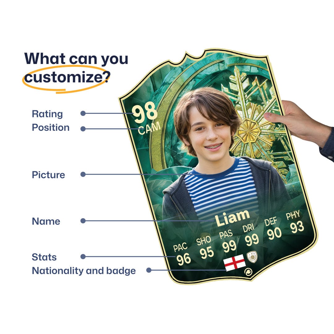 When it comes to personalising your card, the basic steps are to upload a photo and add a name to your card. Then you’ll add details like your player’s position and skill ratings out of 99 for each football skill shown on the card. Our online card builder makes this really easy. And if you aren’t a football card expert, don’t worry!