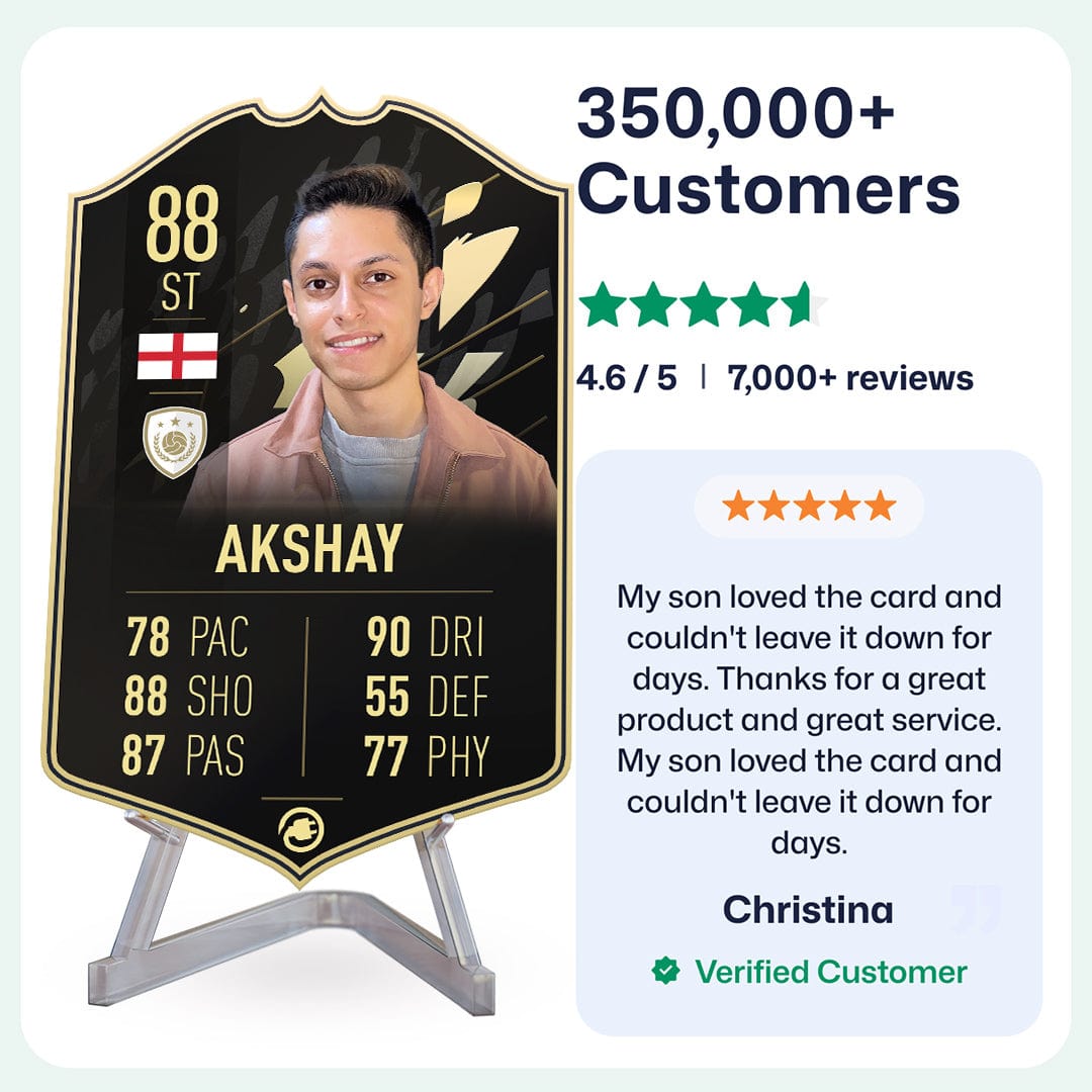 Once you’ve personalised your card, our design experts will edit your photo, design your card, and bring it to life in stunning quality. You’ll get a full preview before we print your card and every card’s quality is backed by our Gold Standard Guarantee. So far, over 350,000+ football fans agree: A CardsPlug football card is the ultimate football gift!
